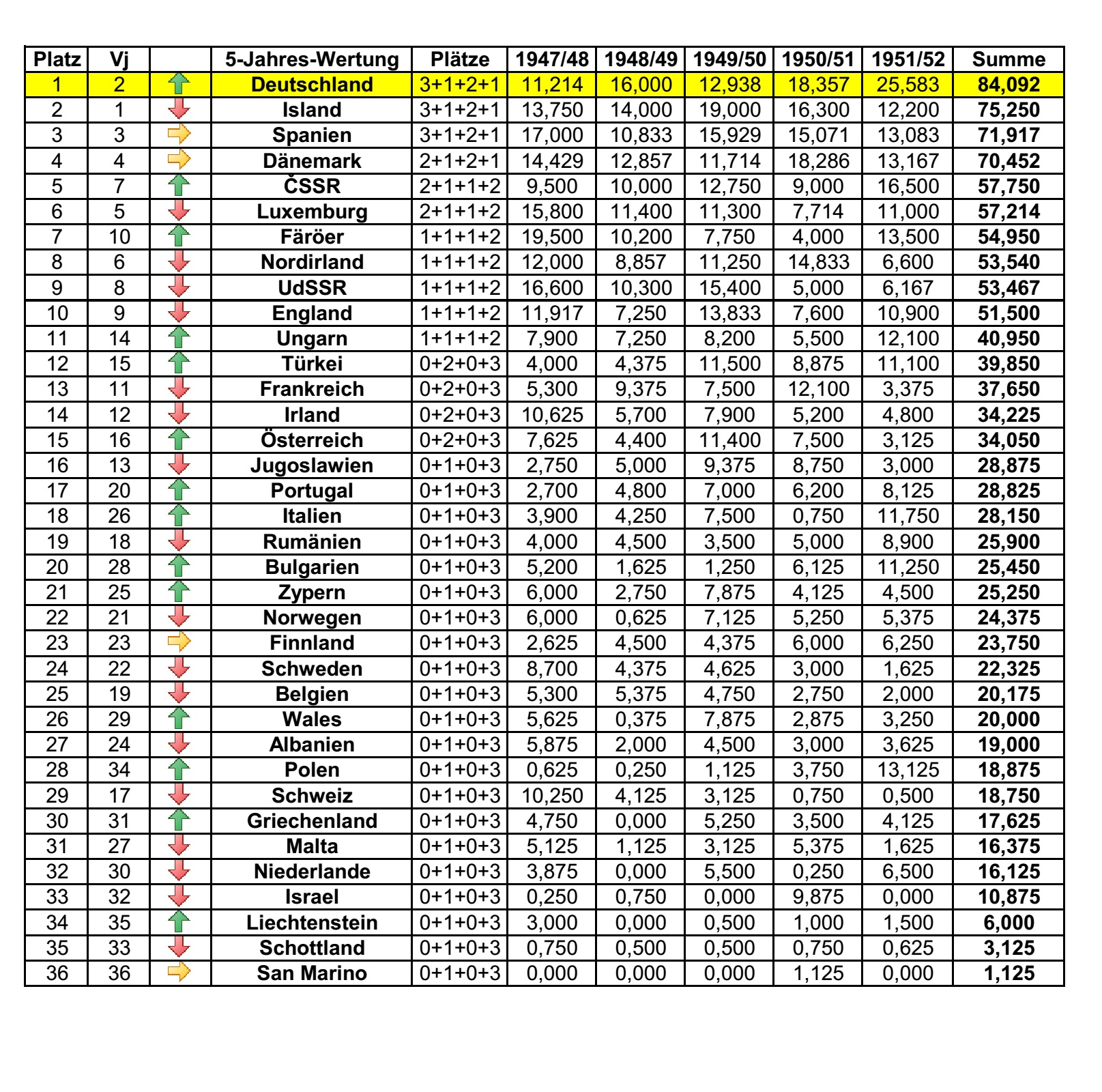 Das ist die aktuelle 5-Jahres-Wertung zur Vergabe der Europapokalplätze in der Saison 1970/71: